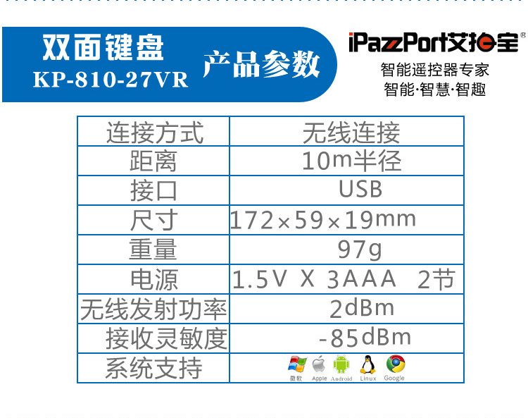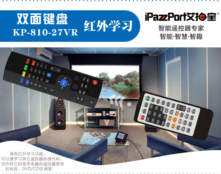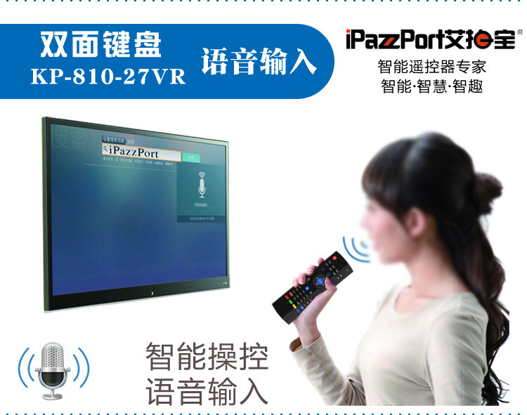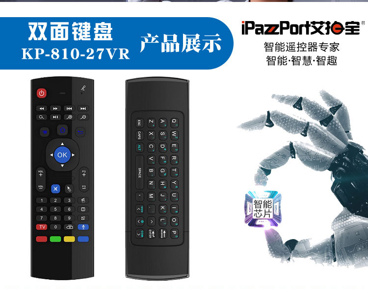 无线语音键盘+红外学习型遥控器 KP-810-27VR最大特点为:语音输入, 还可以通过红外功能远程控制其他家电设备。双面设计理念超乎想象力。适用于车载电视,HTPC,大屏电视,智能电视,硬盘播放器,网络播放器,X-BOX的外接键盘。