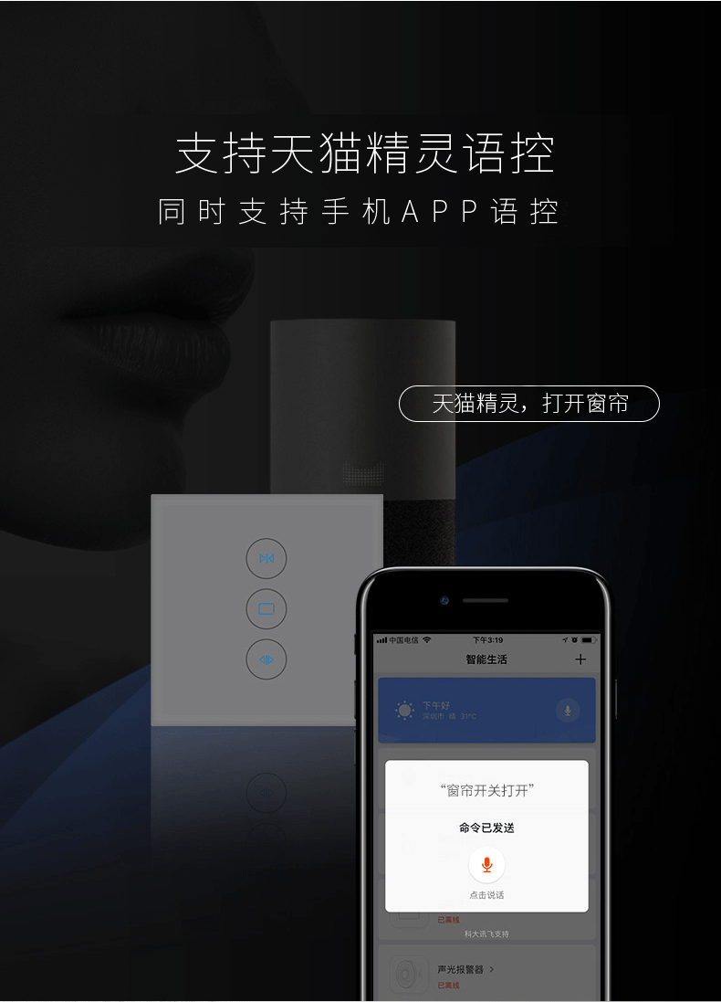 - 多种控制模式:触控,声控,遥控,远程控制相结合