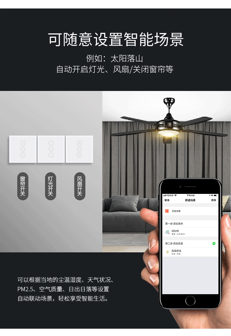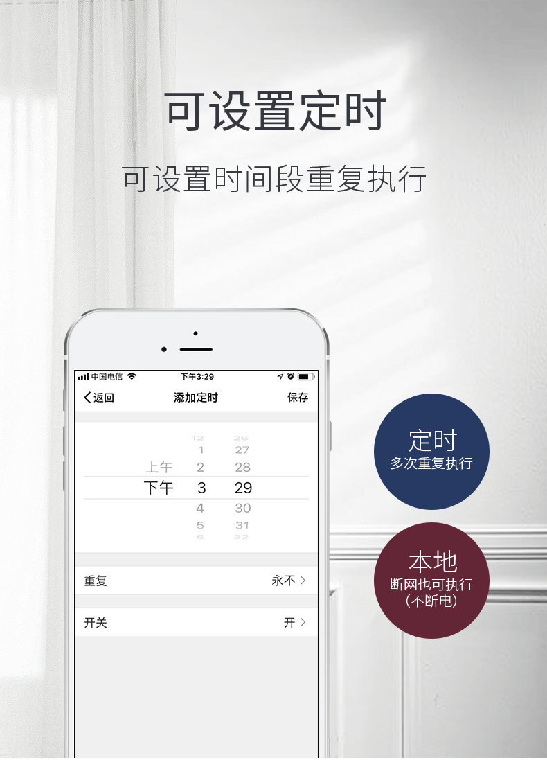 - 自定义控制:通过手机App可设置时间,倒计时,家人共享,