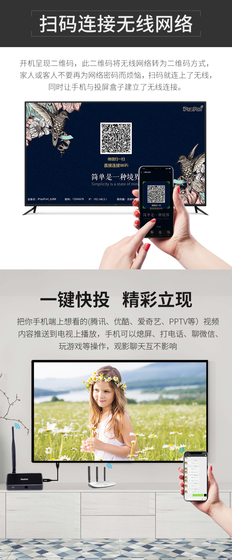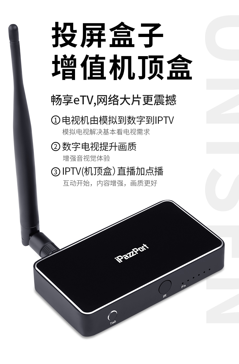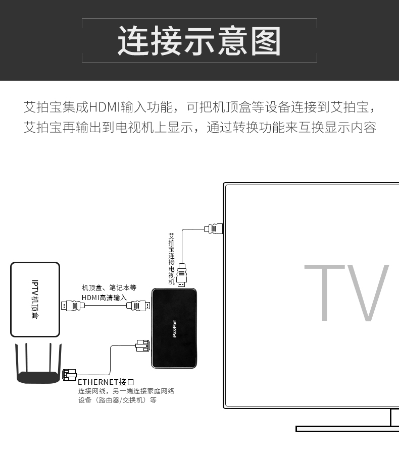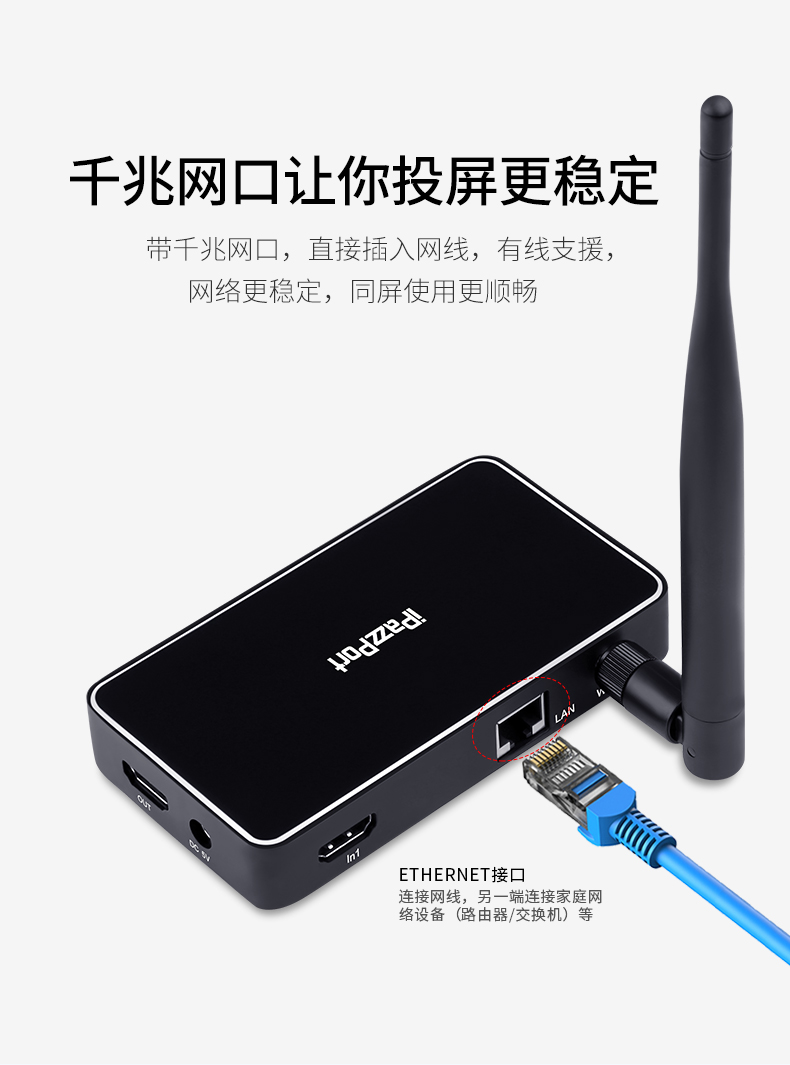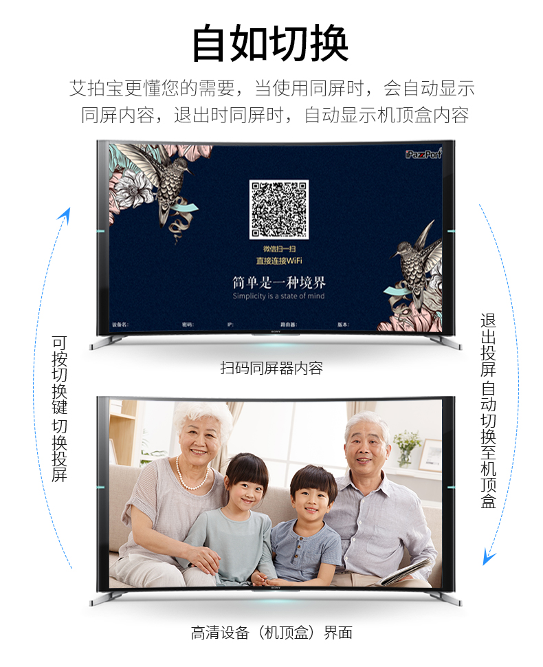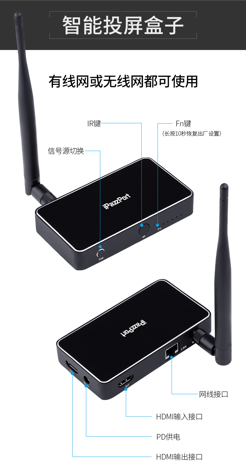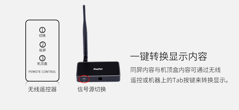 9HDMI投射和机顶盒之间的自由切换:将机顶盒与此ipazzportcast连接,然后与电视连接,然后您可以通过遥控器(可选项)或者按压投屏器上的切换按钮进行信号源的转换