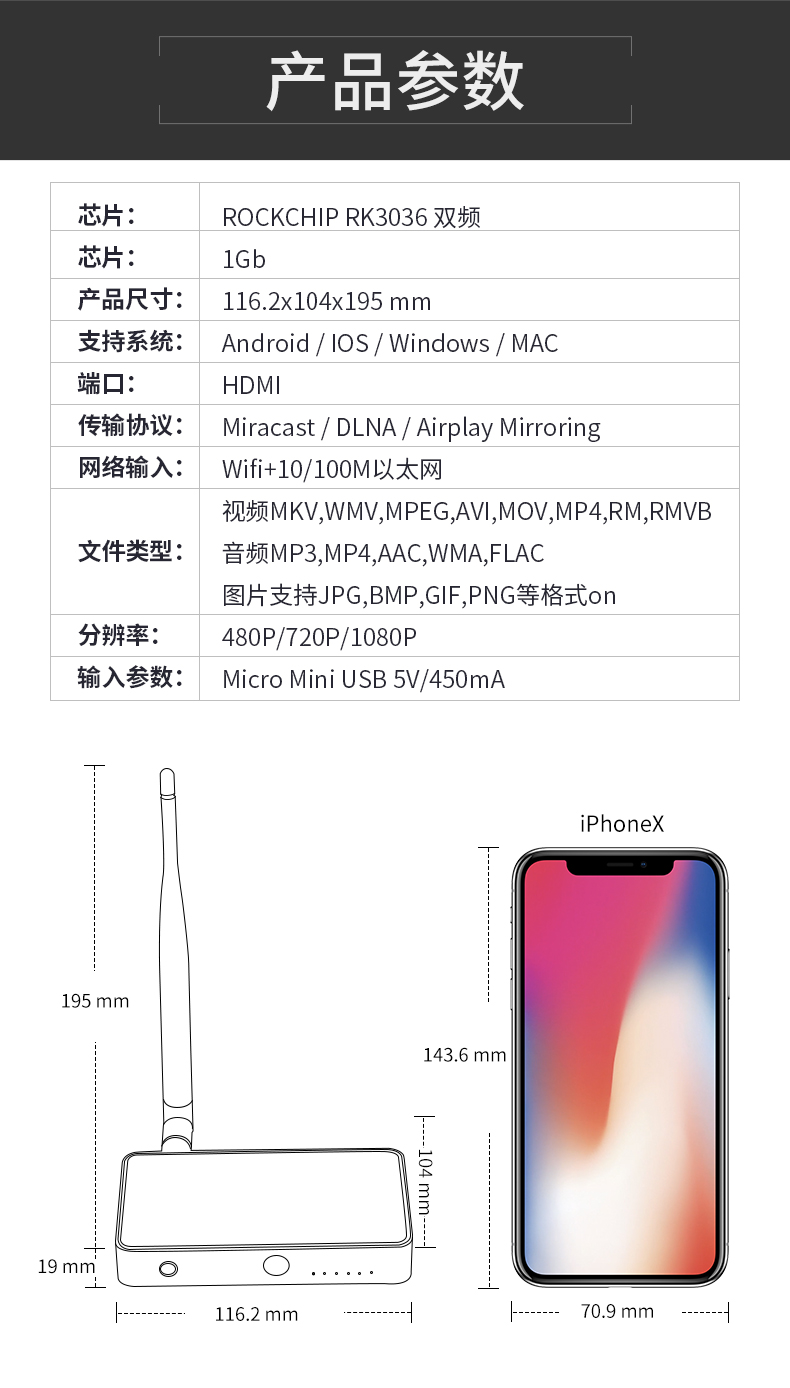 2)支持DLANAirplayMiracast协议; 显示流畅无延迟;